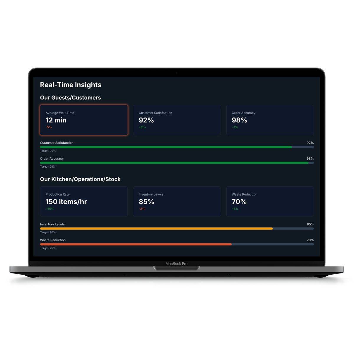 Telana created a real time data dashboard to surface operational and service insights for restaurant staff, enabling faster stock and inventory decisions, and upsell opportunity identification.